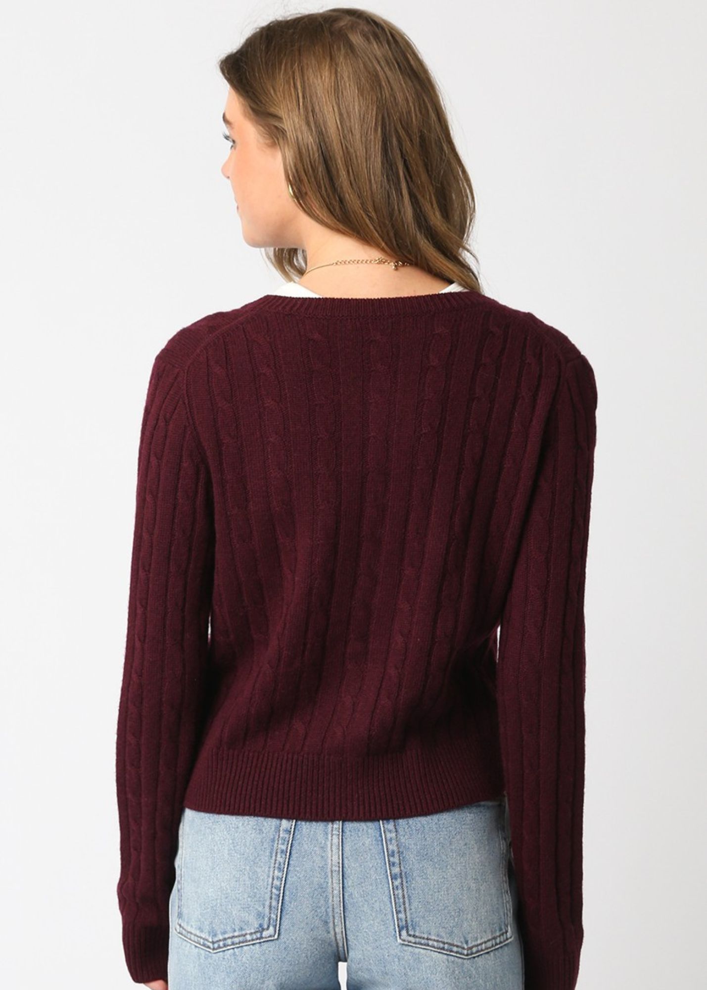 - Dark red cable knit cardigan